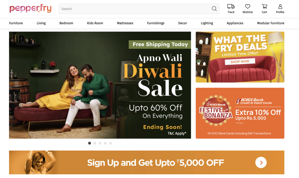 Pepperfry also prepared its eCommerce website for the Diwali season by placing festive sales headers.