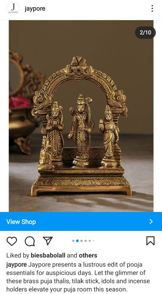 Jaypore sells accessories, apparel, and other exceptional artisanal products with unique local craftsmanship across India. Being a brand that focuses on traditional and ethnic products, Jaypore made the most of this Diwali season by running paid ads on social media.