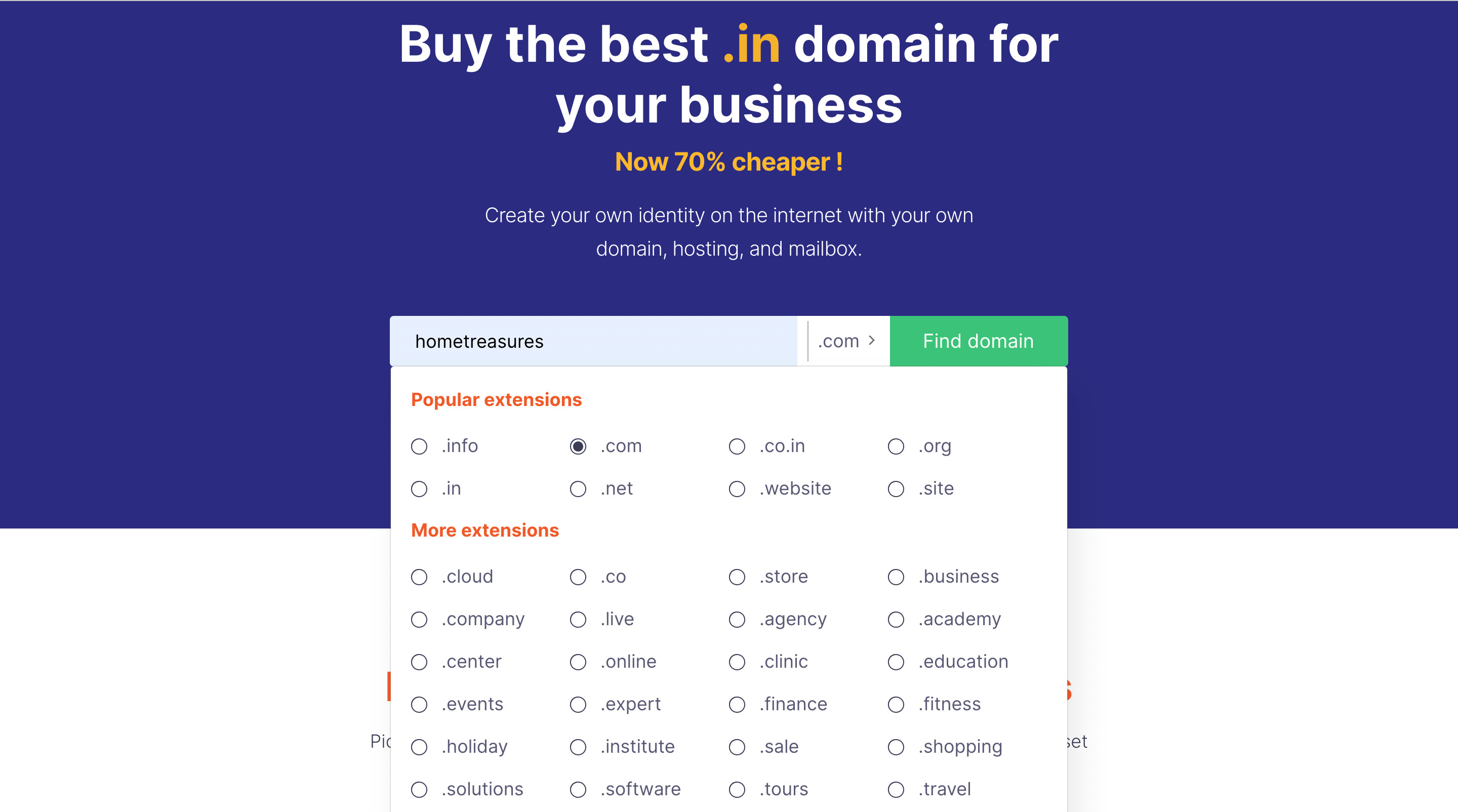 However, try to get a .com extension if possible. It’s the most credible extension, chosen by millions of businesses. Another great option for Indian businesses is .in extension — the country code TLD (top-level domain). If both these are not available, you can go for any other extension available, such as: .co.in, .shop, .academy, .store, .travel, .software