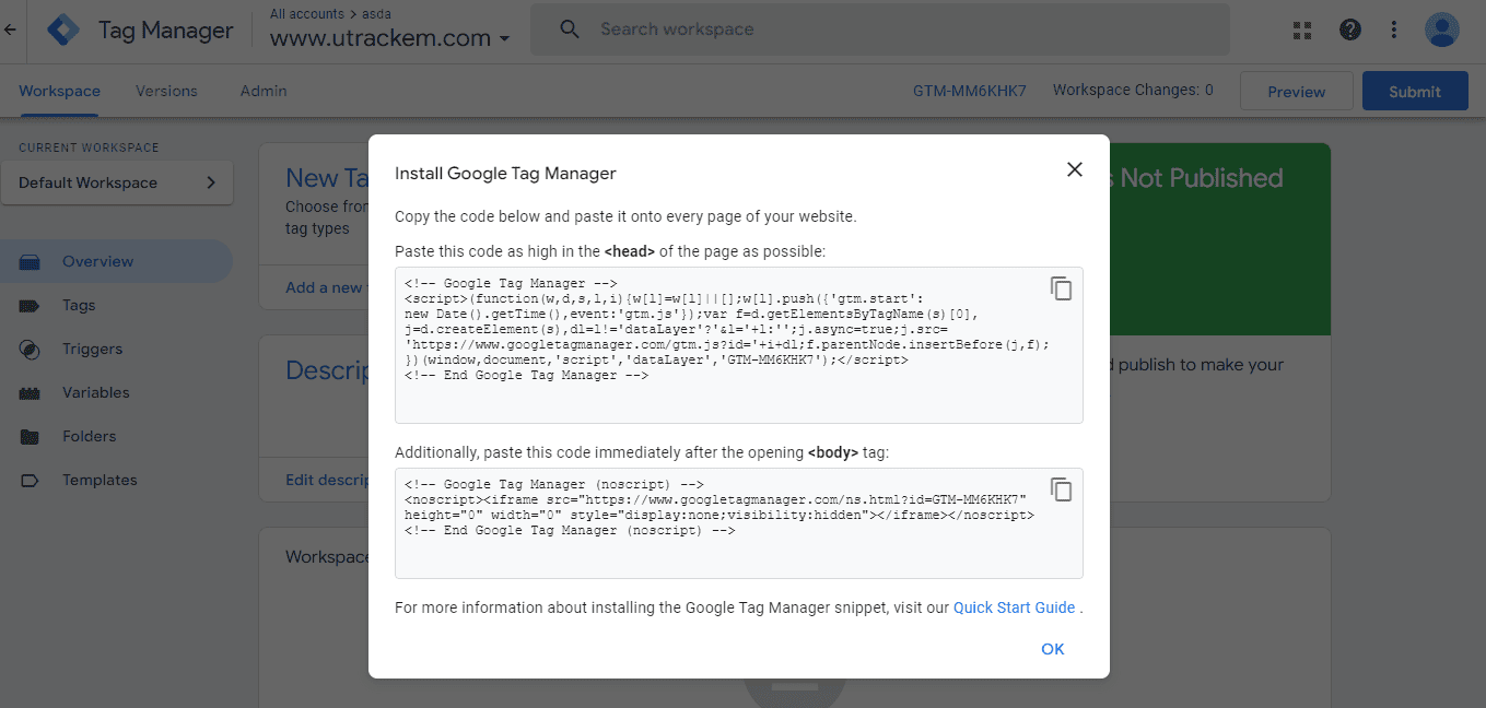 Create a Google Tag Manager account by entering the basic details like account name, country, website address and target platform (Web).