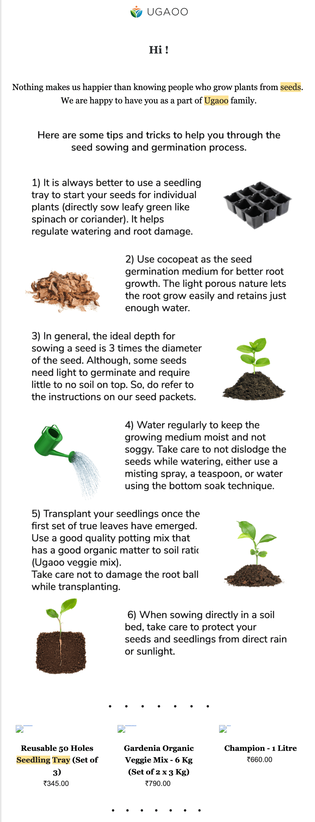 Ugaoo, a DTC brand that sells plants online, sends out personalised newsletters after a customer has purchased. Here’s the personalised email they send to customers right after purchase:
