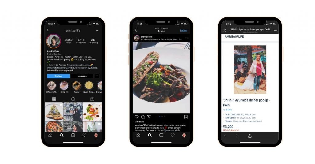 Amrita, like many of us, makes food look really pretty on Instagram. A mini-celebrity herself, Amrita’s healthy-food cooking classes are almost always sold out. She uses Instagram to market her cooking workshops very effectively.