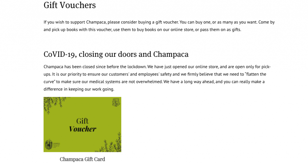 This was an initiative I personally enjoyed contributing to – buying a gift card. Champaca Cafe, a local bookstore cafe, took to the online space and asked folks to buy gift vouchers to keep their business going. You buy a gift card and redeem it later in the cafe.