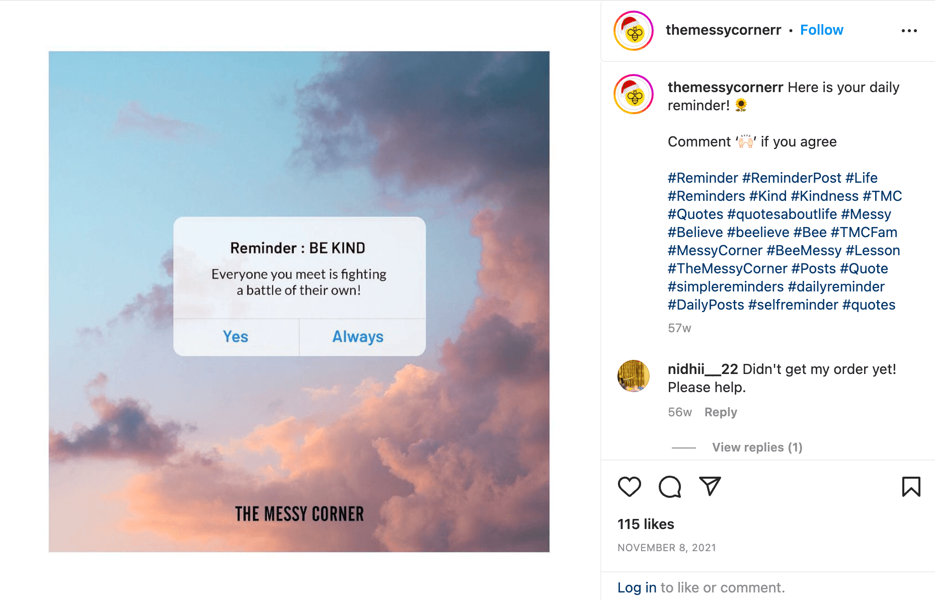 In the below post, Messycorner inspires people to be kind. And, it creates positive associations between your audience and your brand, which is always a good.