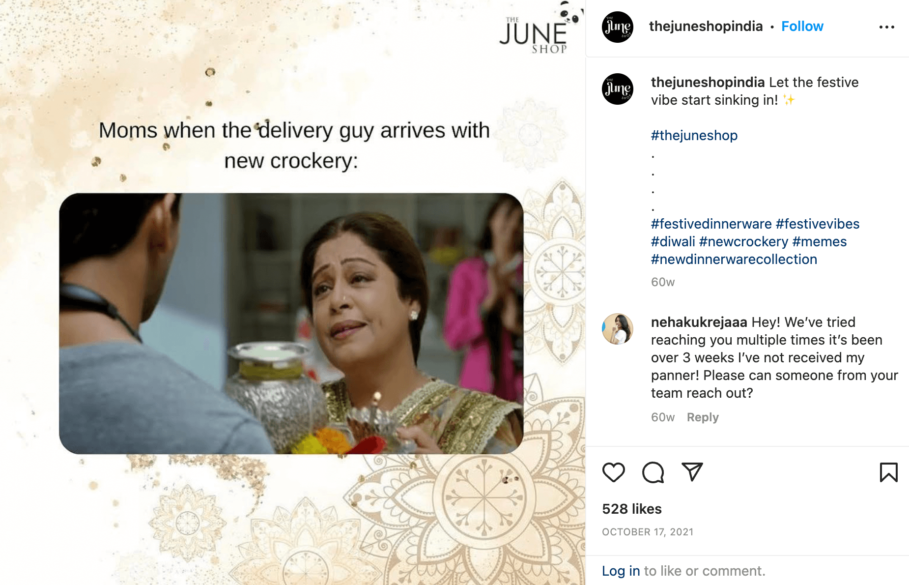 Make sure that the meme is related to your niche or business in some way, and not a random one. June shop does this well in the above post.