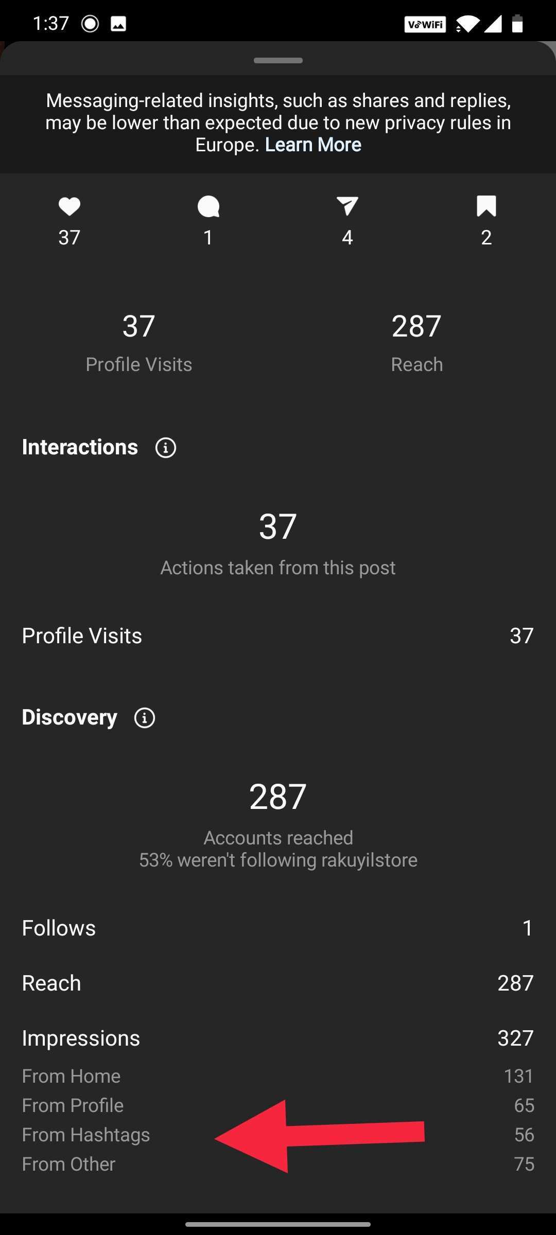 Got an Instagram for a business profile? You can see how many impressions each hashtag generated for you by clicking on ‘View insights’ beneath your post.