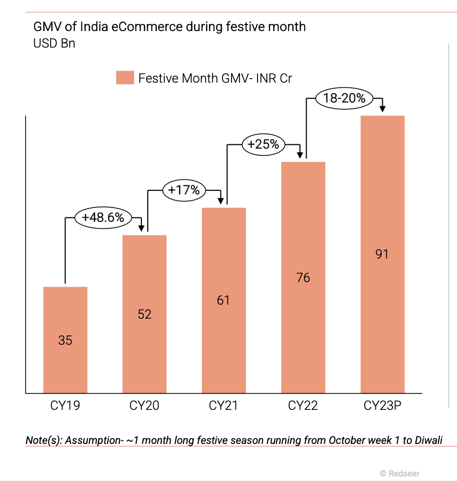- The total eCommerce gross merchandise value (GMV) is expected to grow by 18-20% to INR 90,000 Cr during the festive season this year from INR 76,000 Cr last year