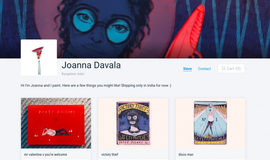 We love to promote our creative entrepreneurs, and this one takes the cake. Joanna is an artist, painter and illustrator and works with little fox films. Her Joanna Davala Store features unique pulp fiction art that you can buy to adorn your living space or office cubicle. You can also find this Bangalore based artist’s work on Behance.