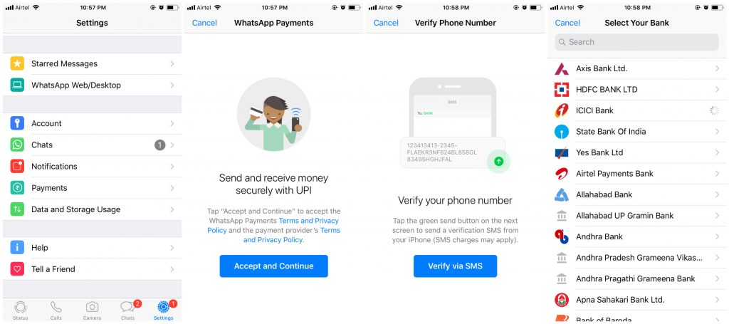 Check your WhatsApp settings for the payment option. Verify your phone number and select your bank.