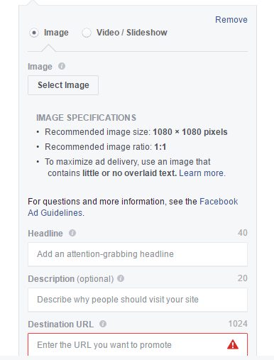 Follow the steps to create your FB ad: