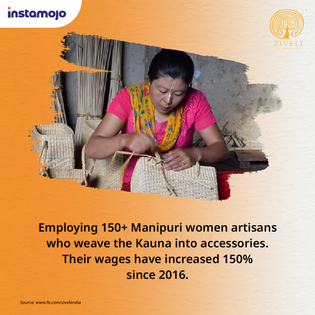 The founders of Ziveli went deep into the villages of Manipur to revive a forgotten art. Ziveli is a lifestyle enterprise that makes accessories with Kauna (a reed that grows in the wetlands of Manipur). It employs about 150 Manipuri women artisans who weave the Kauna into beautiful products like bags, accessories, etc. Their wages have increased by 150% since 2016.