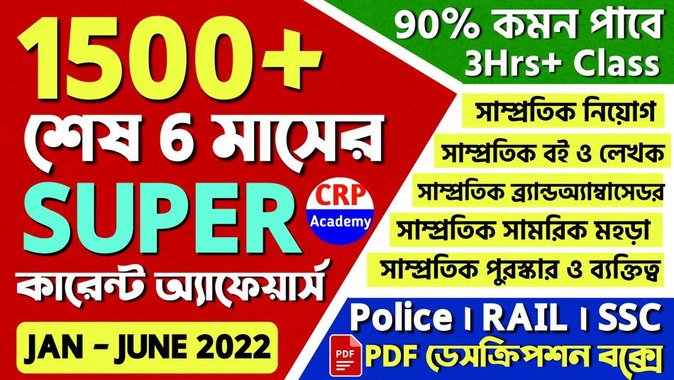 2022 সালের জানুয়ারি মাস থেকে জুন মাস পর্যন্ত উল্লেখযোগ্য 1500 টি কারেন্ট অ্যাফেয়ার্সের প্রশ্ন। এই Pdf -এ যেসব বিষয়গুলো পেয়ে যাবে সেগুলি হলঃ